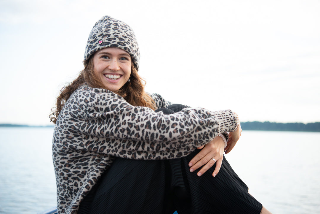 Diese kuschelige Mütze mit modernem Leoprint ist aus 50 % feinstem Cashmere und 50% Wolle gestrickt und hält Kopf und Ohren angenehm warm – ganz ohne Kratzen oder Jucken.