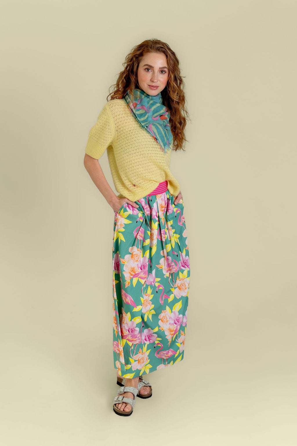 Edler Kaschmirpullover für Damen mit Ajour-Strickmuster und kurzen Ärmeln in Gelb und dazu Baumwollerock Bella mit Flamingo-Tierdruck, Modelbild