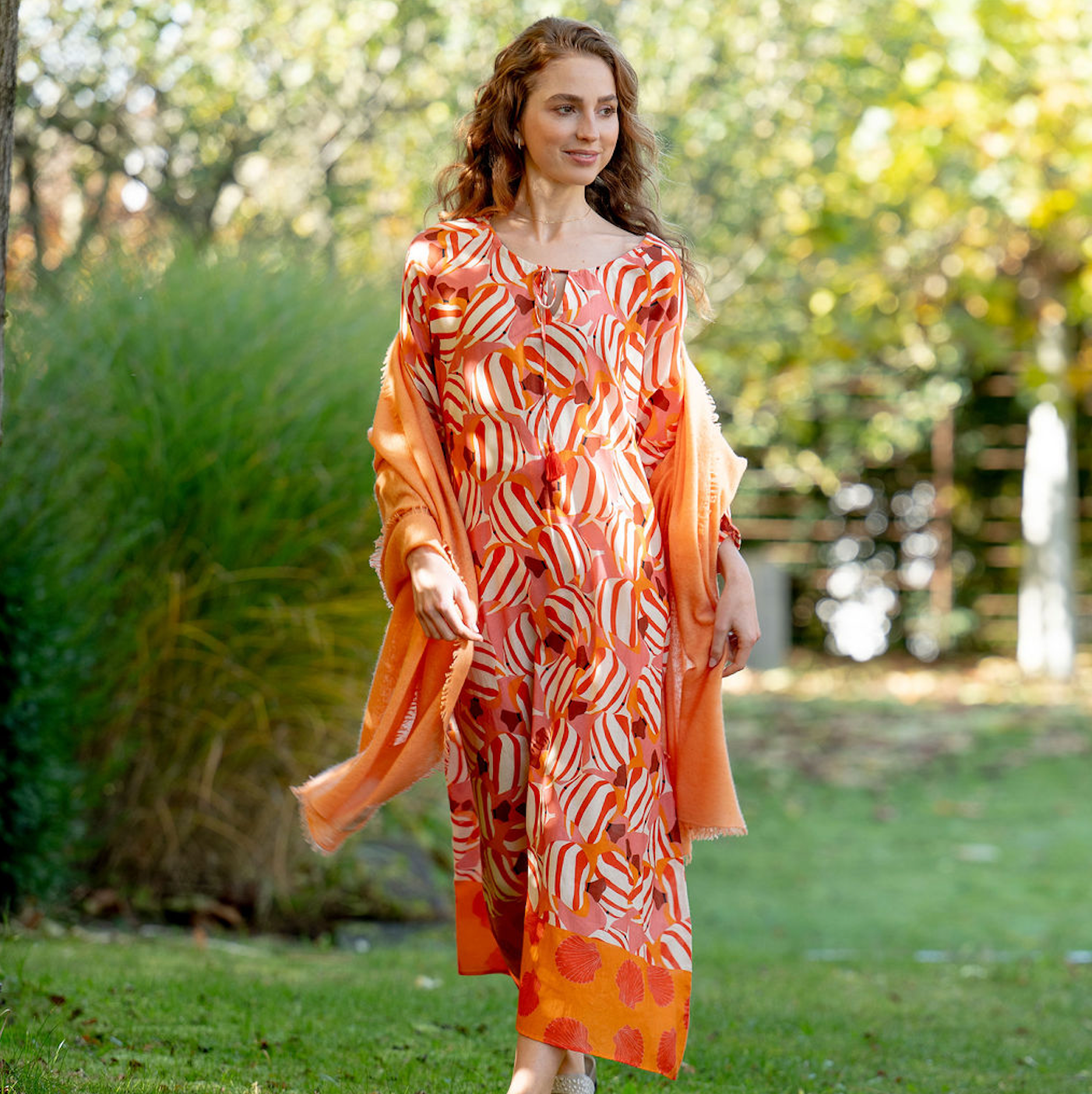 Der Feli-cs-Schal von cute stuff ist ein exklusiver Light Cashmere Schal aus 100 % reinem, hochwertigem Kaschmir, gefertigt in traditioneller Handarbeit in Nepal. Die Farbe Nektarine – ein Orangeton – verleiht jedem Outfit einen fröhlichen Touch.
