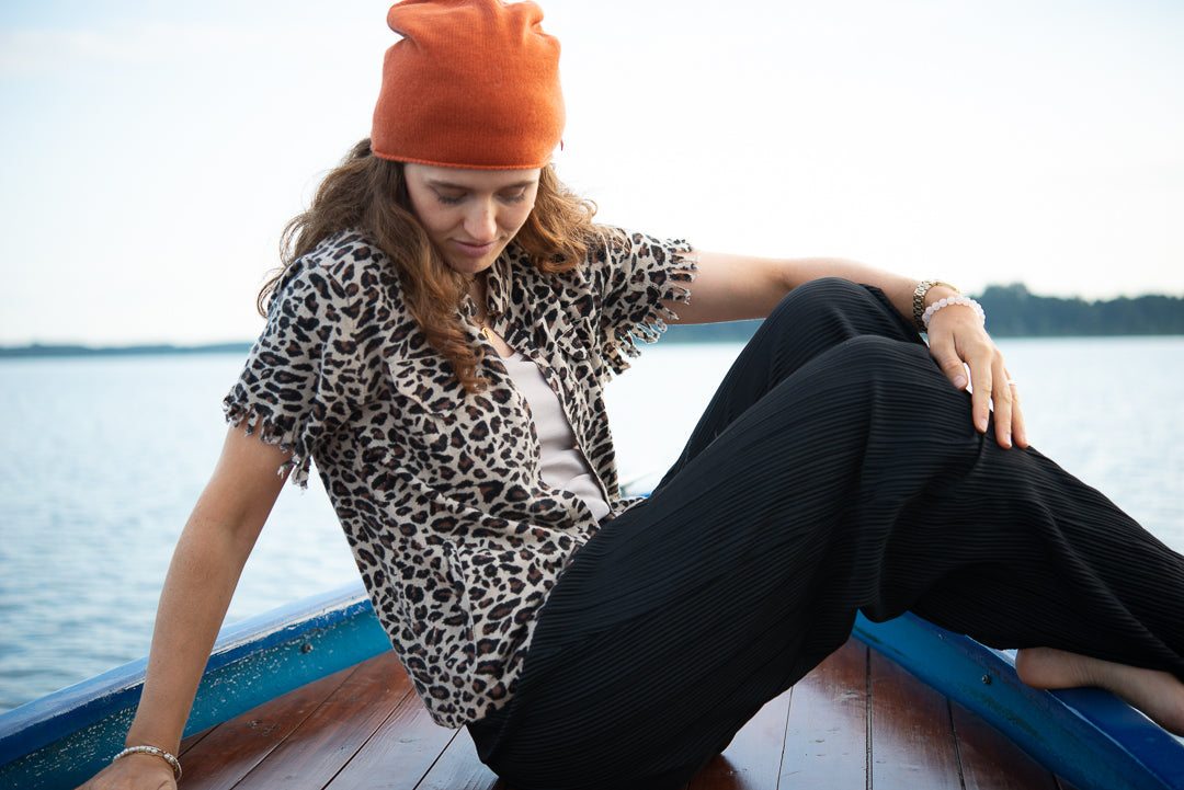 Mit dem Kurzarm-Cardigan „Olivia-cs“ wird der Leoprint-Look alltagstauglich und besonders! Der weich fallende Strick in braunem Allover-Leomuster kombiniert kurze Ärmel mit verspielten Fransenbündchen, zwei aufgesetzten Taschen vorn und zwei zusätzlichen Seitentaschen – ideal zum schnellen Reinschlüpfen und Wohlfühlen.