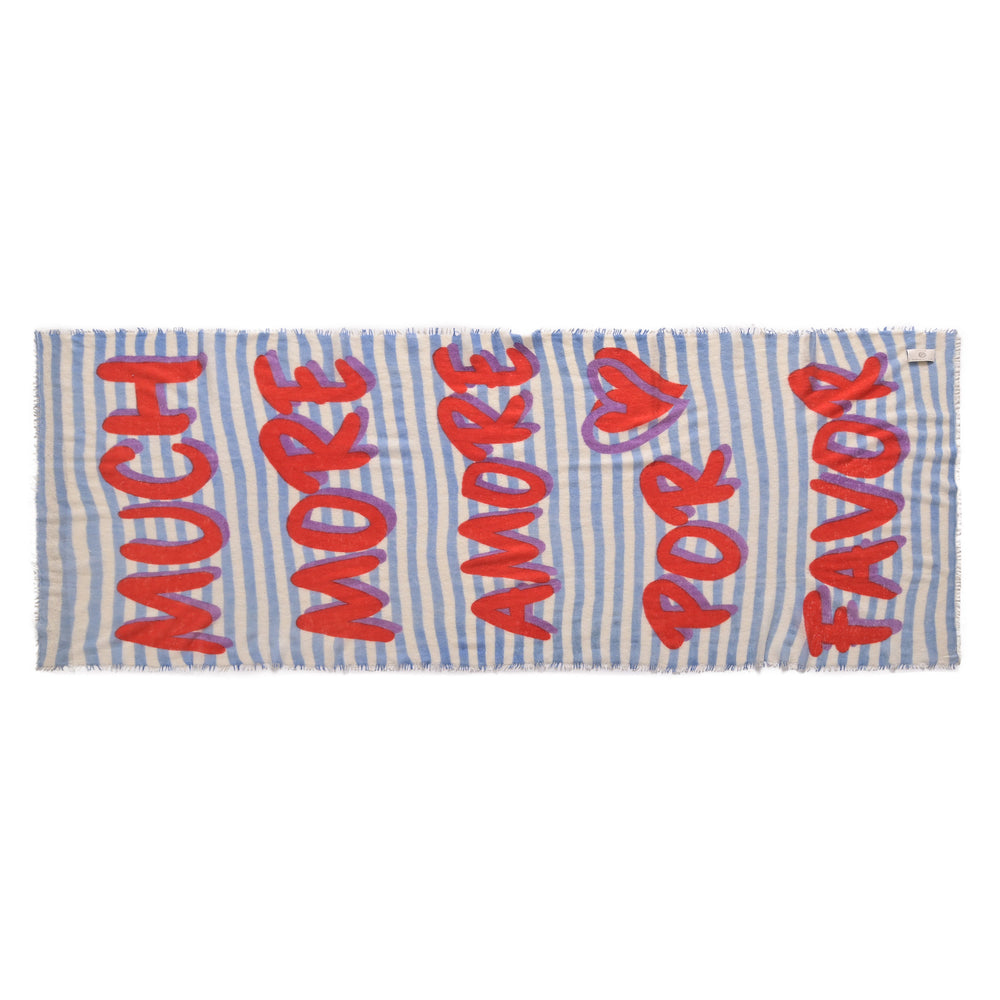 Dieser weiche und anschmiegsame Cashmere Schal hat Streifen in Flieder und Weiß. Der Blickfang des Schals ist der prominent aufgedruckte Schriftzug "Much More Amore Por Favor". Der Kaschmirschal für Damen kann zu jeder Jahreszeit getragen werden kann!