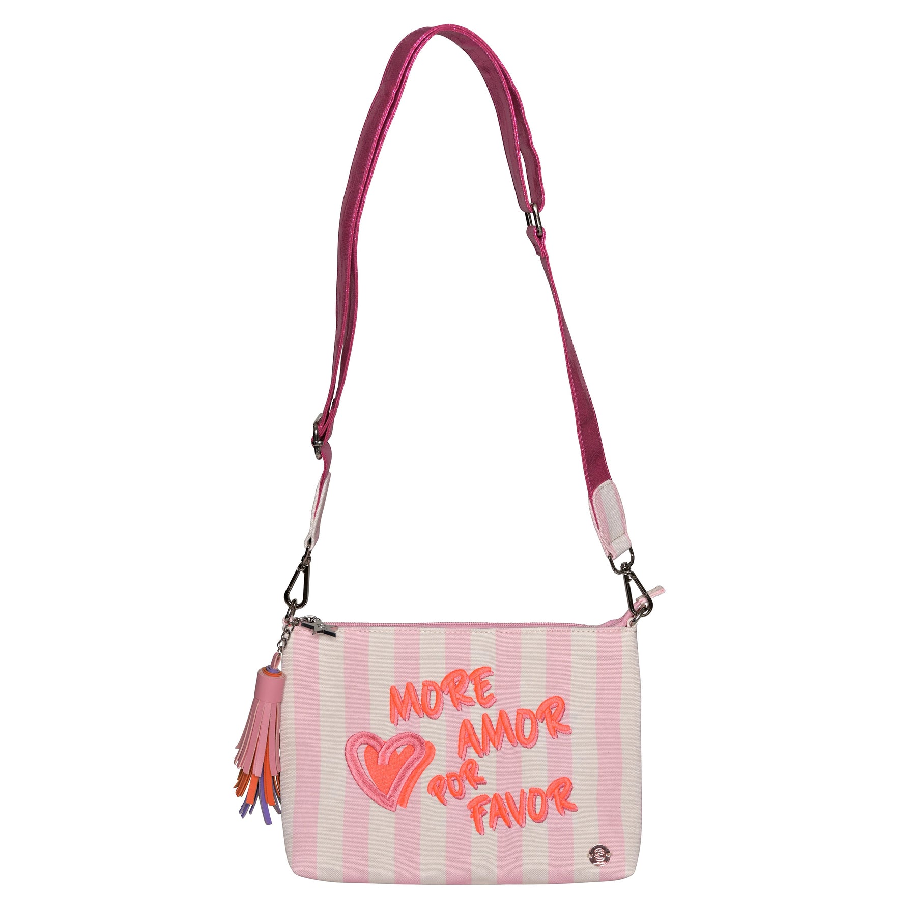 Die Tasche mit Streifen und dem Schriftzug: "More Amore Por Favor" eignet sich nicht nur als Cosmetic- und Make-up Bag sondern auch als Clutch. Besonders "cute" ist der dreifarbige Pompom-Anhänger mit silbernem Stern am Reißverschluss. Die Cosmetic Bag hat ein kleines Reißverschlussinnenfach und einen Tragegurt (der abnehmbar ist), damit sie auch als Umhängetasche getragen werden kann.